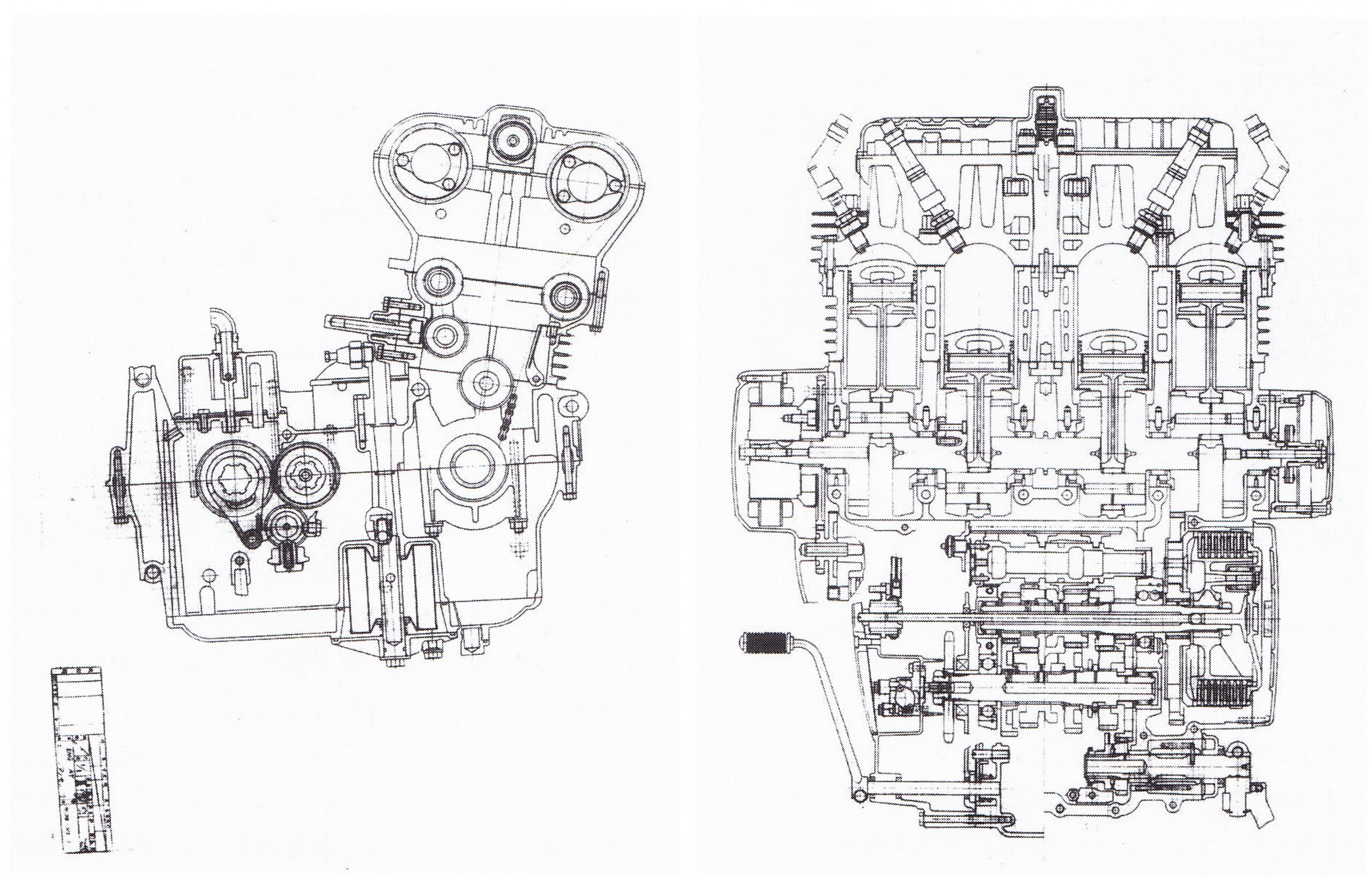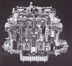 - The inline four-cylinder engine has the potential for improved performance. To ensure the high-speed performance potential of a four-stroke engine, it was considered necessary to lighten the valvetrain and ensure system rigidity, regardless of whether the intake volume or the engine speed was increased. For this reason, a DOHC with direct valvetrain was chosen. (Although it was expected to be more expensive, the cylinder head structure would be simpler than the OHC that would be used in the future.)