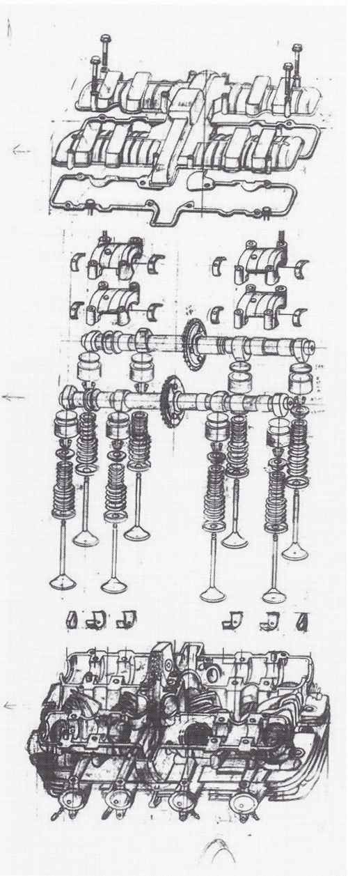 First: Gas and oil leaks from the cylinder head gasket. This was due to the fact that we were unable to achieve wind protection equivalent to the cooling airflow at cruising speed, and also because the gasket itself was performing poorly. Its primary function was to prevent leakage caused by excessive heat and surface pressure. The reason for the excessive surface pressure was that the gasket was secured between the aluminum cylinder with the pressurized cast iron liner and the cast aluminum cylinder head with a steel bolt anchored in the crankcase. During sustained high-performance operation, the gasket was so worn due to the different thermal expansion of the two materials that it could no longer be repaired. During operation, neither gas nor oil leaks occurred, but after stopping and restarting the engine, the gasket's sealing capability was compromised. To solve this problem, we planned to use a material with better surface pressure recovery for the seal in the next prototype, increase the mating surface to reduce the surface pressure, adjust the washer to achieve uniform surface pressure, and seal the cam chain tunnel with a heat-resistant silicone rubber ring.