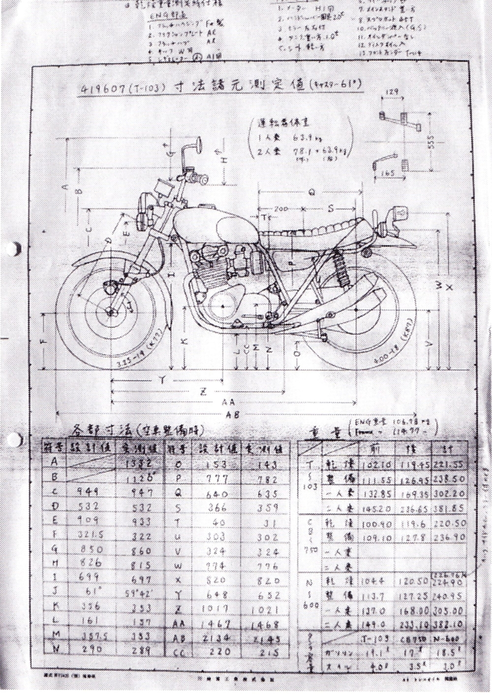 The T-103 Prototype This model's displacement was approximately 900 cc or more, it was an inline four-cylinder with variable camshaft control, and the development code was changed from N600 to T-103. With the T-103, it was important to increase the displacement to approximately 1200 cc by boring it out, as it was intended to compete with Honda. In February 1970, as production of the N600 reached its final stages, Don Grapes, the head of sales for KMC USA, came to Japan and attended the testing at the Motorcycle Research Institute in Yatabe, Ibaraki Prefecture. As expected from the head of the local sales department, his riding skills were impressive, and he seemed pleased with the performance.